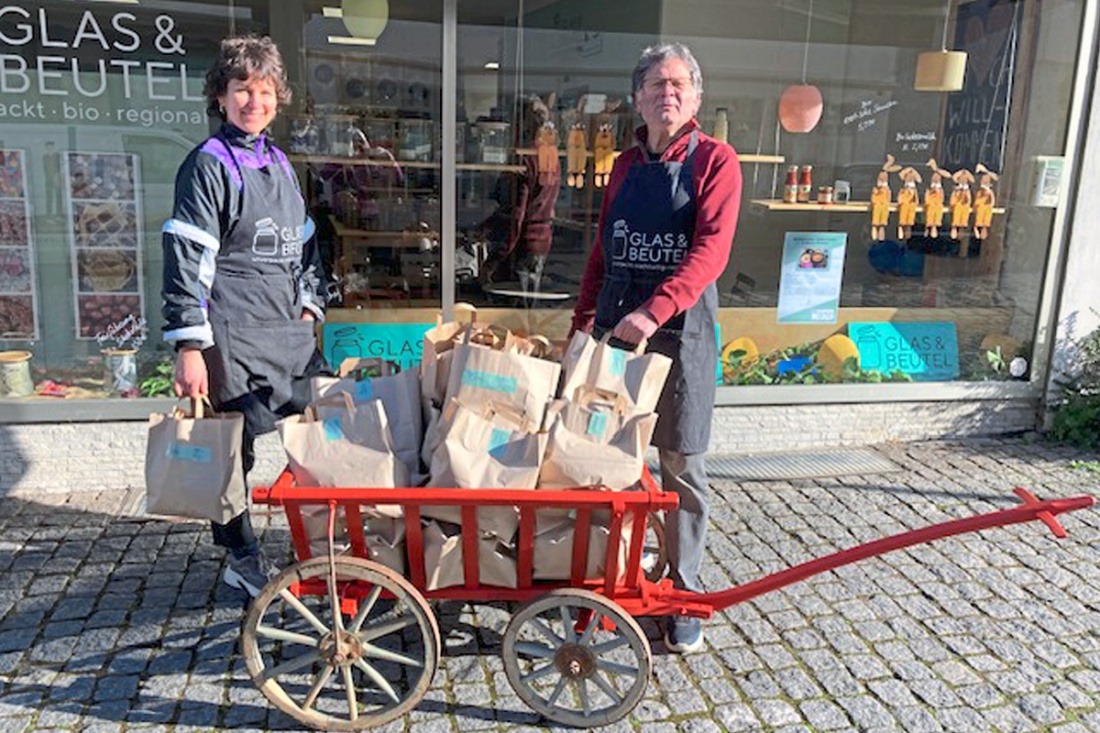 Die Ladenleiterin von Glas und Beutel, Manuela Demuth, und Walter Fieger, einer der ehrenamtlichen Vorsitzenden des Genossenschaftsladens, beim Abtransport der gefüllten Tüten.Foto: privat