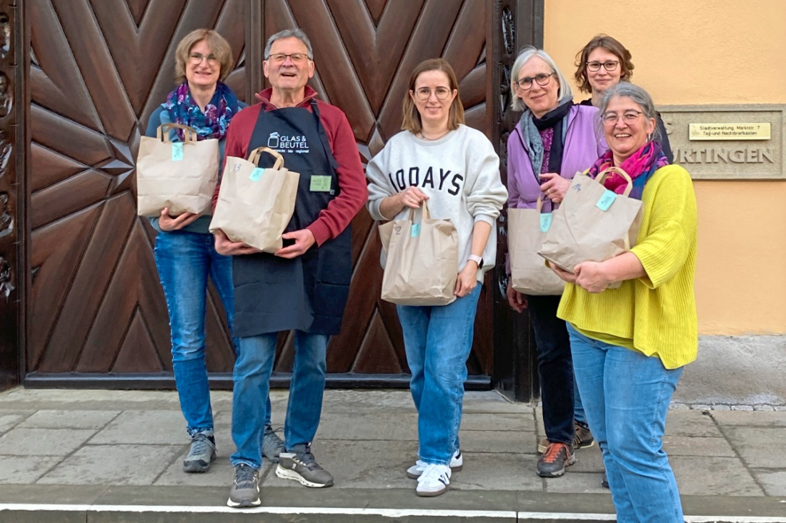 Walter Fieger, einer der ehrenamtlichen Vorsitzenden des Genossenschaftsladens, übergibt die Tragetaschen mit den Leckereien an einige Leiter der Wahllokale vor dem Nürtinger Rathaus.Foto: privat