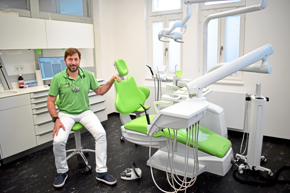 Philipp Mattle in einem Behandlungszimmer im ehemaligen Lindenbad. Seit Anfang dieses Jahres betreibt der Zahnarzt dort seine Praxis.Foto: Julian Baum