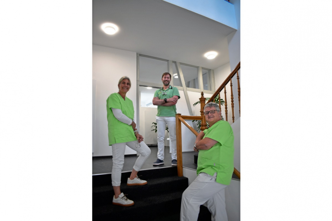 Viel Platz für viele Mitarbeiter: Philipp Mattle (Mitte) mit Marion Henzler (stellvertretend für das Praxisteam) und Zahnarzt Christof Wurster.Foto: Julian Baum