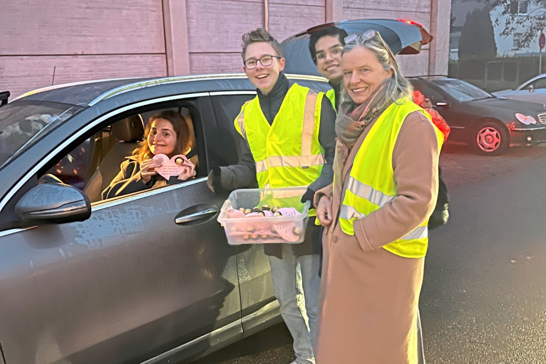 Sicherer Schulweg: Am Dienstagmorgen sorgte die Aktion der Schulleitung vor Schulbeginn für große Aufmerksamkeit. Die neue Haltezone wird von den Eltern positiv auf- und angenommen.
