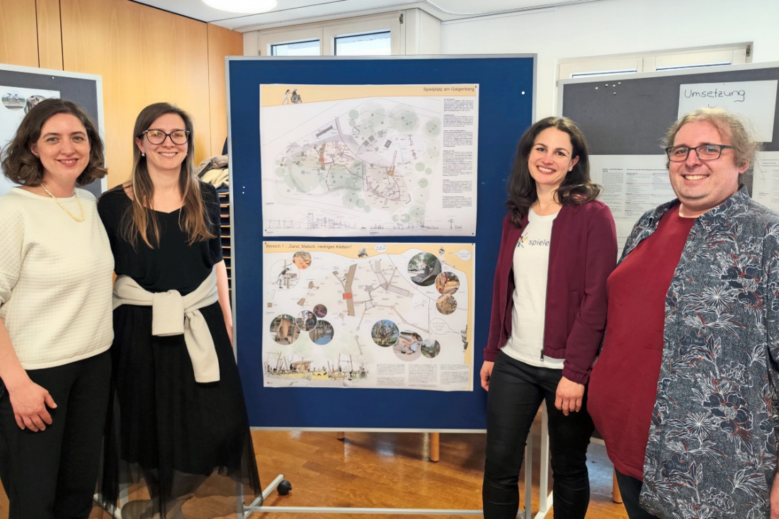 Sehr zufriedene Gesichter nach dem Votum der Kinder für den Spielplatz-Siegerenwurf (von links): Jana Hof, Ina Steiner sowie Astrid Fridrich vom Förderverein für ein kinder- und jugendfreundliches Nürtingen und Landschaftsarchitekt Sebastian Ertel.Foto: Kai Müller