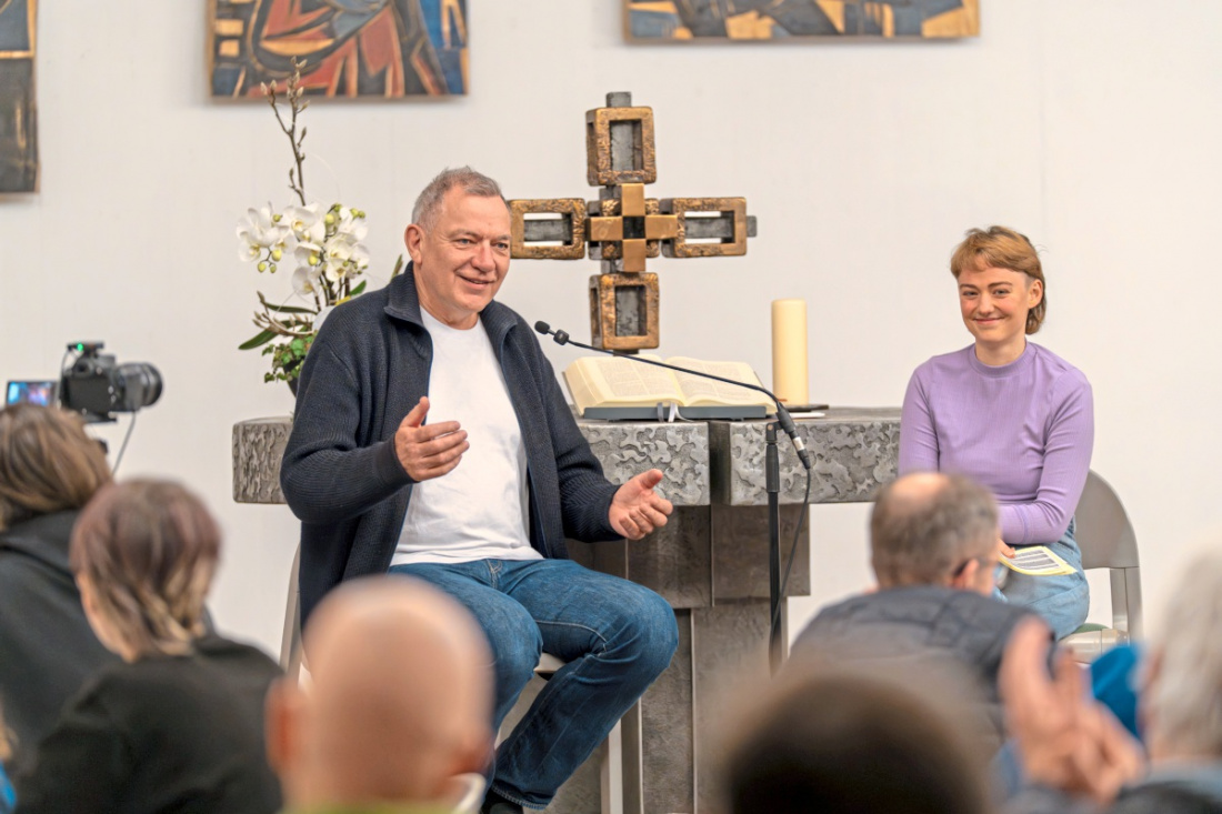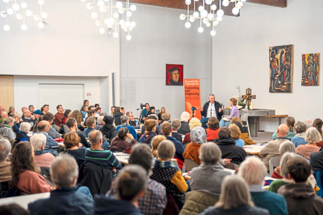 Im Martin-Luther-Hof sprachen die Landtagskandidatin und der Bundespolitiker über Friedenspolitik. Rund 200 Interessierte füllten den Saal.