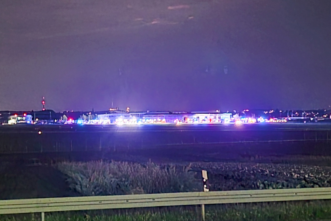 Zahlreiche Einsatzfahrzeuge waren am Mittwochabend auf dem Flughafengelände zu sehen. Foto: René Wolf