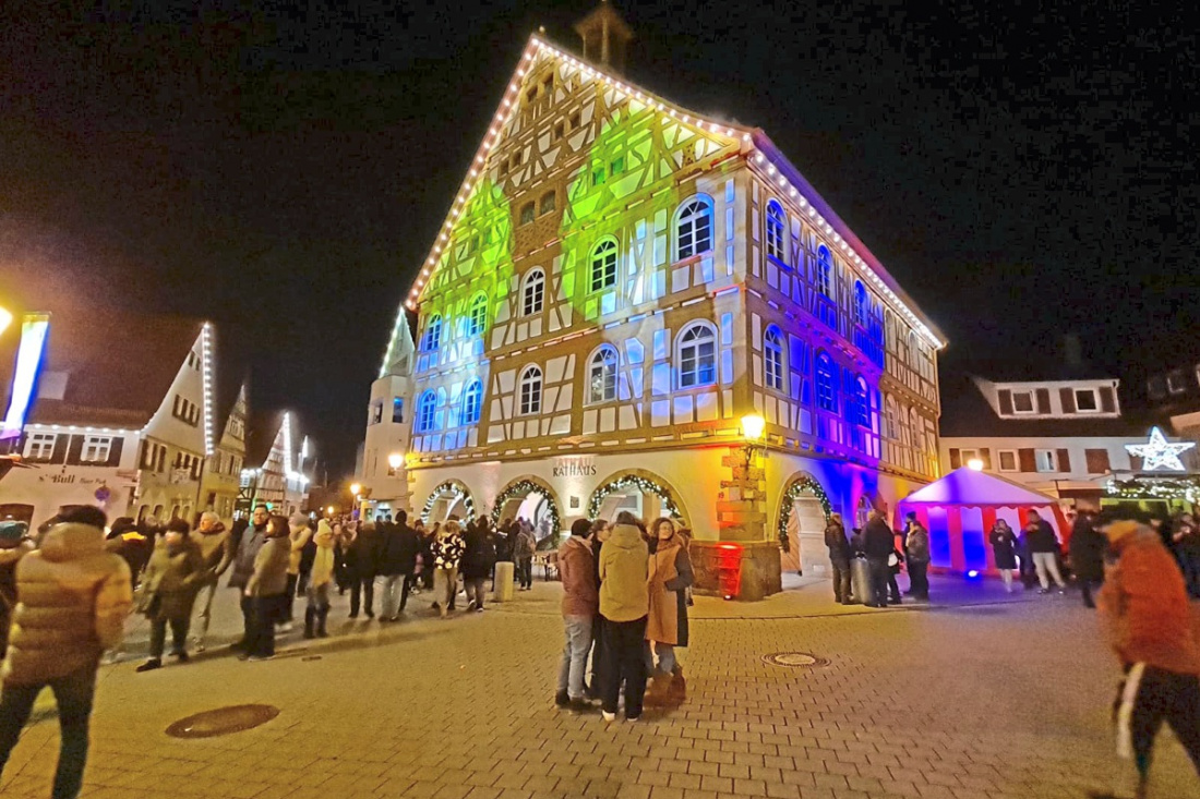 Erstmals illuminiert wird in diesem Jahr die Kelter. Auch der Keltervorplatz wird in das Festgeschehen einbezogen. „Das bedeutet, dass hier keine Parkplätze zur Verfügung stehen“, erklärt Ina Spring. Mit der gesperrten Hauptstraße und dem Bereich um Kirche, Rathaus und Kelter habe man so einen kompakten Bereich, in dem sich die Besucherinnen und Besucher entspannt aufhalten und flanieren können.