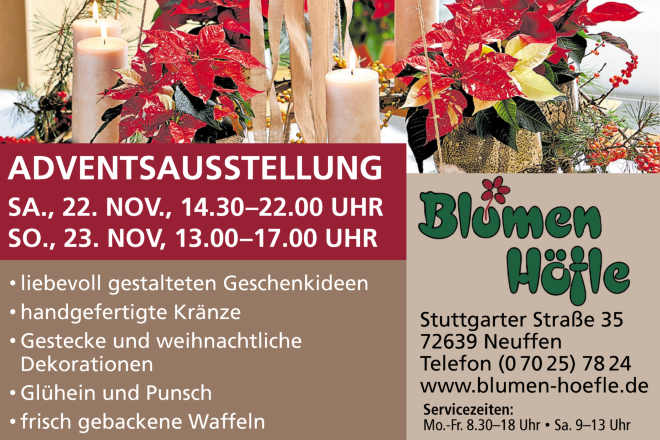 Über das innerstädtische Gelände verteilen sich verschiedene Stände mit kulinarischem und liebevoll hergestelltem, kreativ-kunsthandwerklichem Angebot. „Aber auch außerhalb des Festbereiches lohnt es sich zu bummeln, denn auch da haben Geschäfte geöffnet“, betont die Mitorganisatorin Ina Spring. Wer sich also Inspirationen für Geschenkideen oder winterliche Deko holen möchte, ist im malerischen Neuffen genau richtig.