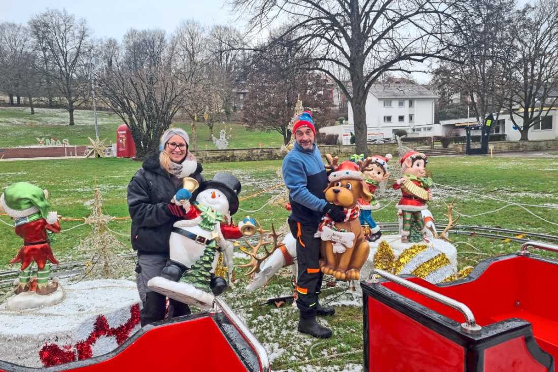 Enikö und Michael Grözinger, Betreiber der Firma BGA Illuminationen, bauen am Montag den Garten der Träume im Nürtinger Freibad ab. Foto: Barbara Gosson