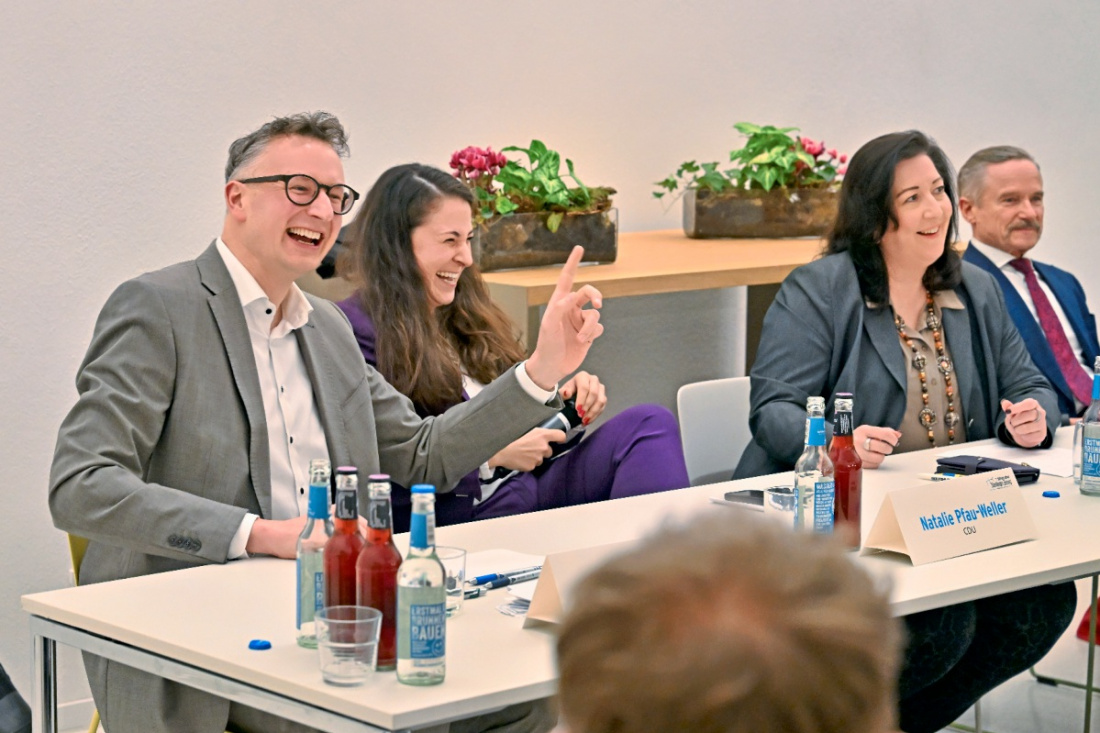 Es gab auch einige heitere Momente während der Podiumsdiskussion – hier mit Andreas Schwarz (Grüne) und Natalie Pfau-Weller (CDU). Auch Nicole Falkenstein und Markus Berthold konnten ein Schmunzeln nicht verbergen.Foto: Stefan Rosenfeld
