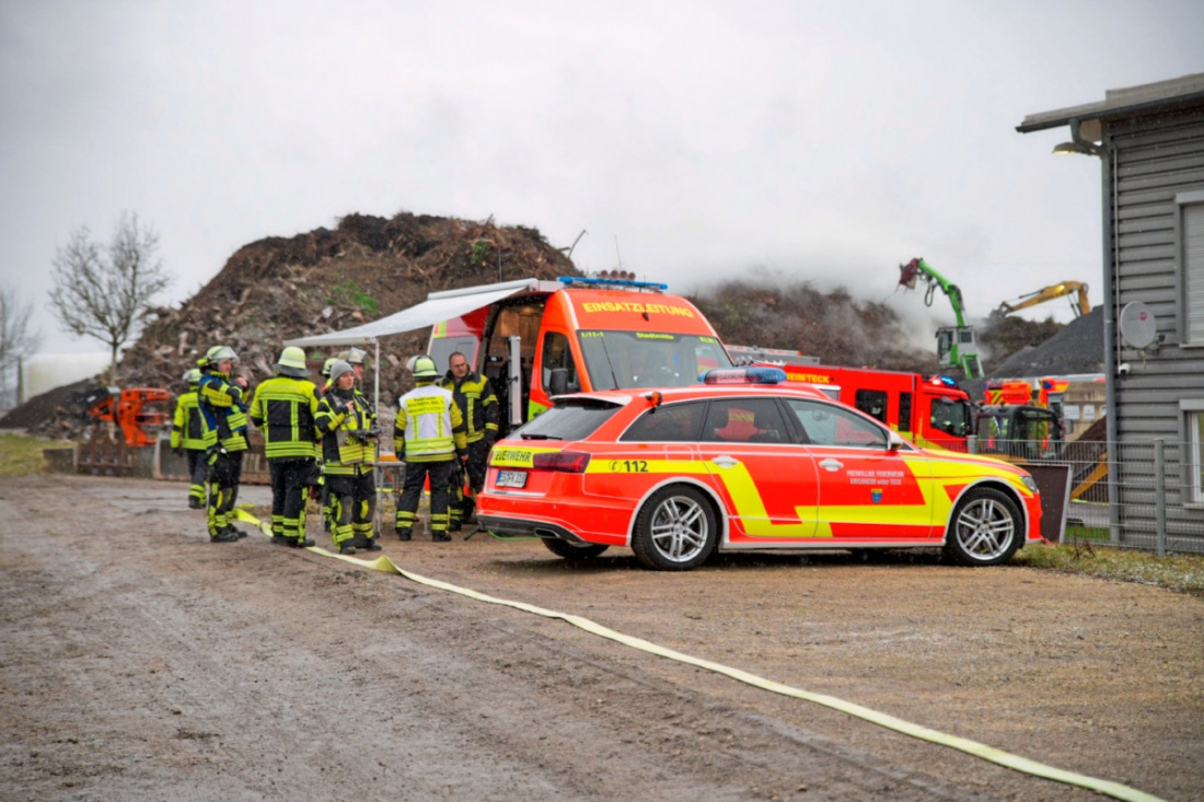 Zahlreiche Abteilungen der Freiwilligen Feuerwehr Kirchheim waren über Stunden mit dem Löschen des Recyclingmaterials auf einem landwirtschaftlichen Anwesen beschäftigt.