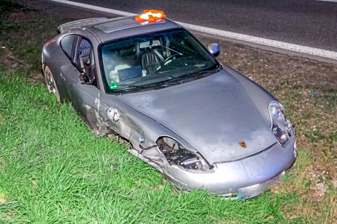 Er krachte dabei auf das Heck eines Mercedes-Benz eines 21-jährigen Fahrers, der wiederum gegen einen Anhänger eines vollbesetzten Reisebusses auf dem rechten Fahrstreifen prallte. Im Anschluss kam der 21-Jährige von der Fahrbahn ab und blieb schlussendlich mit seinem Auto im Grünstreifen liegen. Er wurde hierbei leicht verletzt. Der Fahrer des Porsche sowie die Fahrgäste im Reisebus blieben unverletzt.