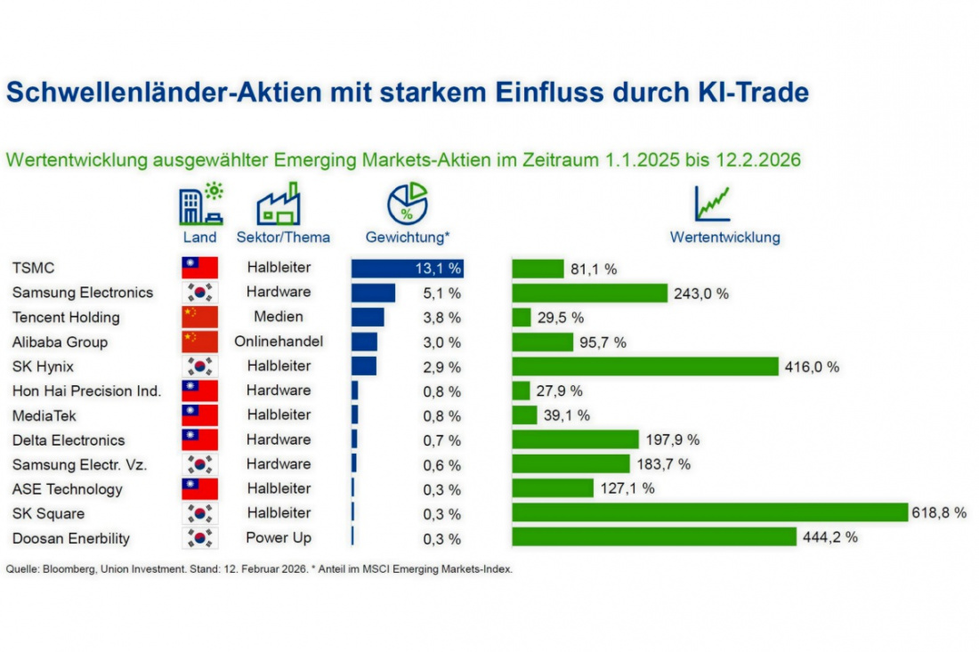 Viele Schwellenländeraktien haben ihren Wert in den vergangenen Monaten stark gesteigert. Zu den Treibern gehört die hohe Nachfrage nach Lösungen aus den Bereichen künstliche Intelligenz (KI) und Robotik. Was das für den Aktienmarkt bedeutet, erklären Experten von Union Investment.