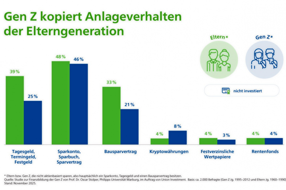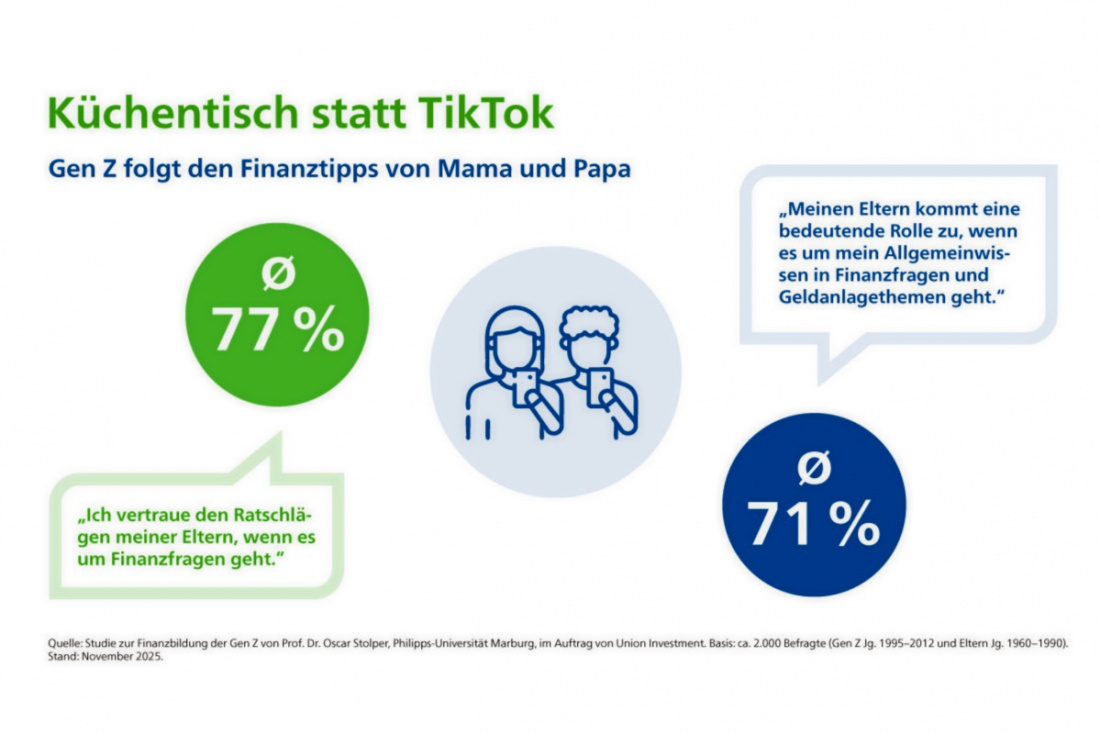 Das zeigt die im November 2025 veröffentlichte Studie „Küchentisch statt TikTok“ von Professor Dr. Oscar Stolper von der Philipps-Universität Marburg im Auftrag von Union Investment. Sie macht deutlich, warum professionelle Beratung in der Bank für Eltern und junge Erwachsene entscheidend ist.