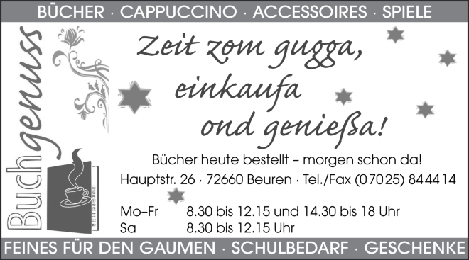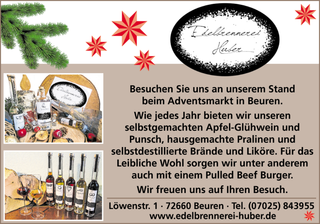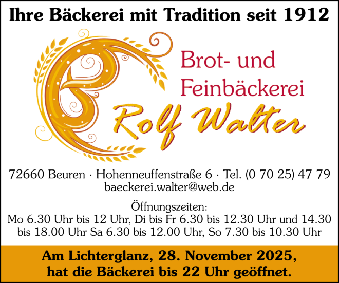 Ob beim gemütlichen Bummel durch den Ortskern und die Gassen, beim Treffen mit Freunden oder beim Staunen über die festliche Beleuchtung – „Beuren im Lichterglanz“ lädt ein, gemeinsam innezuhalten und die Vorfreude auf die Adventszeit zu spüren.