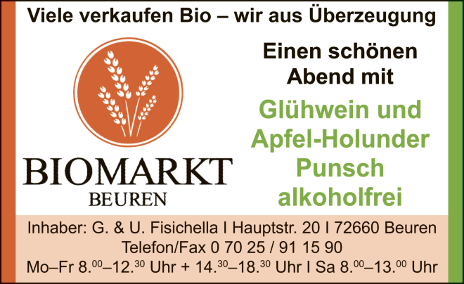 „Beuren im Lichterglanz“ am Freitag, 28. November, 16 bis 21 Uhr, stimmt auf das erste Adventswochenende ein mit langem Einkaufsabend, rund 50 Markt- und Kulinarikständen in der Ortsmitte, Kreativem im Bürgerforum und Frischgebackenem aus dem Backhaus.