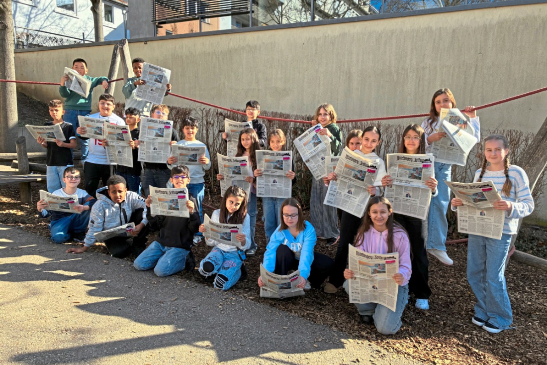 NÜRTINGEN. Das ist die Klasse 4b der Mörikeschule Nürtingen im Herzen der Stadt. Das Bild zeigt: Die Schülerinnen und Schüler haben die Zeitung auch auf dem Pausenhof dabei und haben ihre lokale Zeitung dabei immer fest im Blick.