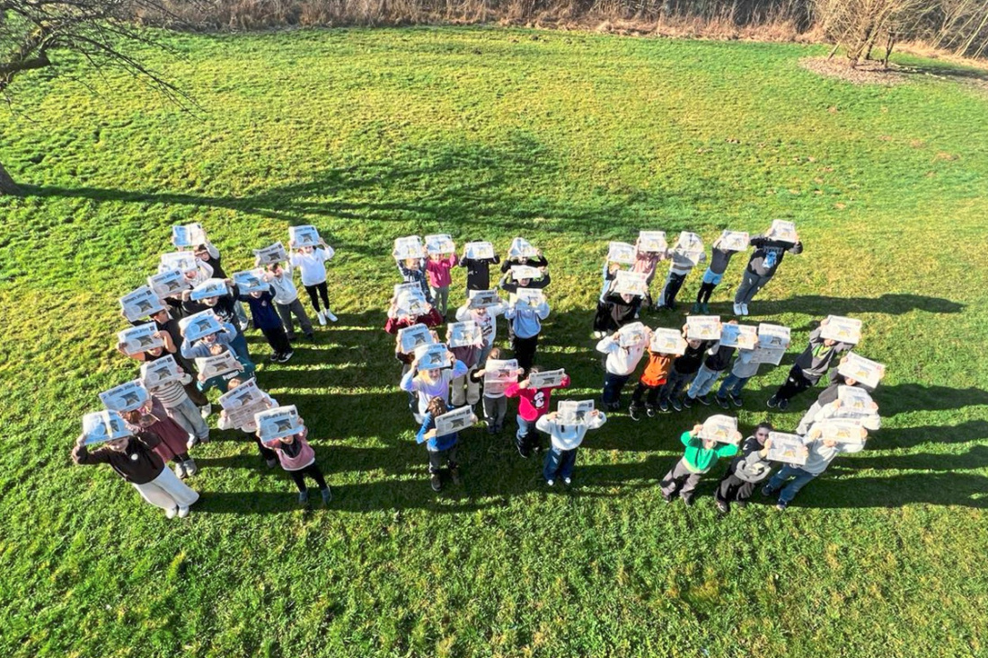 OBERBOIHINGEN. Auf diesem Bild sind die Klassen 4a und 4b der Kirchrainschule Oberboihingen zu sehen. Ihr Motto lautet „Blatt für Blatt – die KRS liest die Zeitung im Grünen“. Die dargestellten Buchstaben KRS stehen für die Abkürzung des Schulnamens.