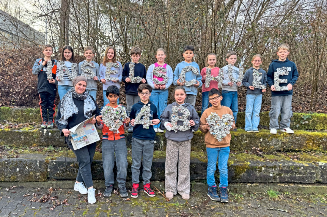 NT-ZIZISHAUSEN. Mit viel Geduld und Kleister schuf die Klasse 4b aus Zizishausen den Schulnamen „Inselschule“ aus Zeitungspapier – darunter zeigt die Klasse 4b mit Herz, wo sie hingehört.