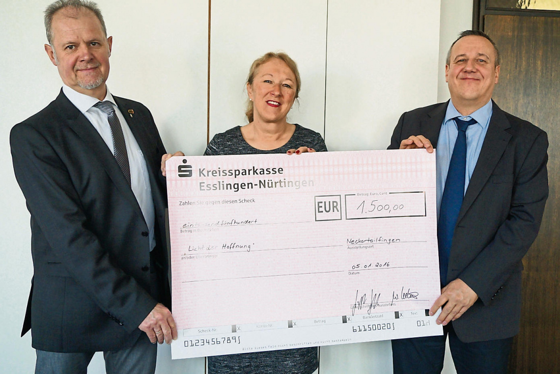Der Sängerbund Neckartailfingen gehört seit vielen Jahren zu den treuen Unterstützern unserer Aktion Licht der Hoffnung. Beim Adventssingen waren wieder mehrere Chöre für die gute Sache im Einsatz. Zusammen mit den 300 Euro, die die Gemeindeverwaltung noch drauflegte, waren es am Ende stolze 1500 Euro. „Eine so hohe Summe hatten wir bisher noch nicht“, betonte Sängerbund-Vorsitzender Wolfgang Kehrer, der jetzt zusammen mit Bürgermeister Gerhard Gertitschke den Spendenscheck in der Redaktion vorbeibrachte. „Eine gelungene Gemeinschaftsaktion“, freut sich auch Bürgermeister Gertitschke über das gelungene Miteinander zahlreicher Akteure in der Neckartalgemeinde. Denn neben den verschiedenen Chören des Sängerbundes hat auch die Kernzeitbetreuung im Rahmen des lebendigen Adventskalenders mit zum stolzen Spendenergebnis beigetragen. NZ-Redaktionsleiterin Anneliese Lieb dankte Bürgermeister Gertitschke und Wolfgang Kehrer ganz herzlich für den Neckartailfinger Einsatz für die Aktion Licht der Hoffnung. ali/Foto: Gosson