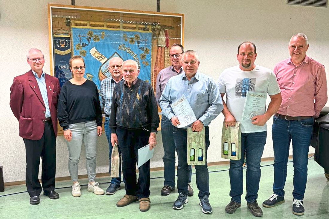 In seiner Begrüßung konnte Vorstandssprecher Ralf Wurster insgesamt 36 Gäste recht herzlich willkommen heißen. Ein besonderer Gruß galt Bürgermeister Volker Brodbeck, und der Chorleiterin Angela Schmauder. Nach der Begrüßung galt es, der verstorbenen Mitglieder Günter Walter und Manfred Wurster zu gedenken. Die Reihe der Jahresberichte eröffnete Rudi Wurster mit einem Kassenbericht, der wieder ein deutliches Plus zu verzeichnen hatte. Für die Kassenprüfer Astrid Nerkamp und Jutta Thüringer bestätigte letztere eine ordentliche Kassenführung. Ralf Wurster berichtete anschließend als Schriftführer über das vergangene Jahr. Die Chorleiterin Angela Schmauder-Scheytt wusste zu berichten, dass ihr das Proben sehr viel Spaß gemacht habe. Sie dankte den Chören für die Kontinuität und Konzentration bei den Proben und Auftritten. Leider war es ihr letzter Bericht, da sie ihre Tätigkeit in Grafenberg aus beruflichen und gesundheitlichen Gründen beenden muss. Die Suche nach einer neuen Chorleitung läuft, brachte aber bisher noch keinen Erfolg. Mit dem Bericht der Vorstandschaft, vorgetragen von Sven Bader, wurden die Berichte abgeschlossen. Er wusste zu berichten, dass die Social-Media-Kanäle sehr gut angenommen werden. Hier gab es einen Followerzuwachs von fast 30 Prozent. Ein Teil des 150-jährigen Jubiläums in 2027 sei mit einem Country-Abend vor dem Oldtimertreffen bereits gebucht. Bevor Bürgermeister Volker Brodbeck nun die einstimmige Entlastung vornahm, richtete er Grußworte an die Versammlung. Er dankte für die vielen Aktivitäten des Vereines in und für Grafenberg, auch mit dem größten Fest des Ortes, dem Oldtimerhock. Der Vorstandssprecher freute sich sehr, die Ehrungen von zwei langjährigen Sängern auf Vereinsebene vornehmen zu dürfen. Auf 25 Jahre aktives Singen konnten Ausschussmitglied Chritian Bader und Vorstandsmitglied Sven Bader zurückblicken. Alle beide kamen bereits mit 16 Jahren zusammen als aktive Sänger zum Verein und haben schon 2004 in jungen Jahren Aufgaben in der Vereinsleitung übernommen. Sie erhielten eine Urkunde und wurden zu Ehrensängern ernannt. 25 Jahre passives Mitglied im Verein sind Alexander Ege und Daniel Thüringer. Bereits 50 Jahre Vereinsmitglied, davon 43 Jahre lang als aktiver Sänger ist Fritz Köstlin. Auch Jochen Kriewald ist 50 Jahre lang Vereinsmitglied. Sogar auf 70 Jahre Mitgliedschaft brachte es Hilde Straub. Beim Punkt „Wahlen“ konnten folgende Amtsinhaber einstimmig wiedergewählt werden. Rudi Wurster als Vorstandsmitglied und Kassier, Rainer Stiefel als Vorstandsmitglied und die drei Ausschussmitglieder Christian Bader, Dietmar Müller und Astrid Nerkamp. Unter „Verschiedenes“ stellte Sven Bader mit einer Präsentation die Idee der Gründung einer Narrengruppe als Vereinsabteilung vor, was nun weiterverfolgt wird.