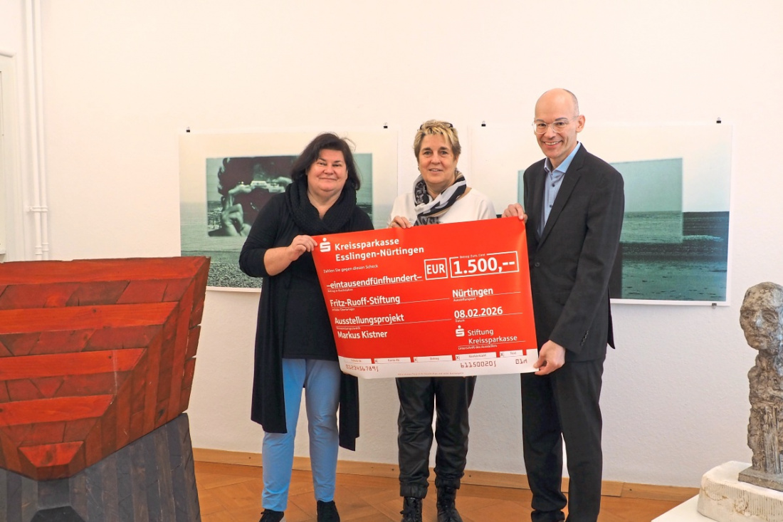 NÜRTINGEN. Mit dem Ausstellungsprojekt „Markus Kistner – Modell Welt“ würdigt die Fritz-und-Hildegard-Ruoff-Stiftung das außergewöhnliche Werk des früh verstorbenen Nürtinger Zeichners und Konzeptkünstlers Markus Kistner. Ermöglicht wurde die Ausstellung dank der finanziellen Unterstützung der Stiftung der Kreissparkasse Esslingen-Nürtingen in Form einer Spende in Höhe von 1500 Euro. Im Rahmen der sehr gut besuchten Vernissage überreichte Marcus Wittkamp, KSK-Teamleiter Gesellschaftliches Engagement, den symbolischen Spendenscheck an Bürgermeisterin Annette Bürkner und die Geschäftsführerin der Ruoff-Stiftung Susanne Ackermann.