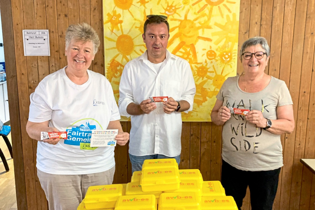 Anne Rahm und Regine Gautsch befüllten die Dosen. Rektor Vladimir Bunoza schaute vorbei und war sehr angetan: „Ich freue mich, dass die Fairtrade-Gemeinde unseren Erstklässler so herzlich einen guten Schulanfang wünscht und bedanke mich für die tolle Aktion mit den fair gehandelten Power-Fruchtriegeln!“