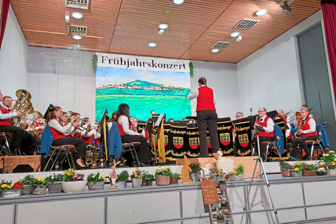 GRAFENBERG. Die ganze Bandbreite ihres Könnens zeigten kürzlich die Aktiven des Musikvereins Grafenberg bei ihrem 42. Frühjahrskonzert. Es war der musikalische Auftakt in das Jubiläumsjahr „100 Jahre Musikverein Grafenberg 1926“ Man nehme eine bunte Mischung aus verschiedenen Musikrichtungen und konzentrierten Musikanten, paare das Ganze mit viel Spielfreude und heraus kommt ein gelungenes Frühjahrskonzert – für die rund 300 Zuhörerinnen und Zuhörer und den Musikverein Grafenberg. Die „Grafenberger Musikanten“ unter der Leitung von Anke Bader eröffneten mit „A little Opening“ den musikalischen Reigen, gefolgt von „How to train your Dragon“ – Musik aus dem gleichnamigen 3D-Computeranimationsfilm „Drachenzähmen leicht gemacht“. Mit „Schmelzende Riesen“ folgte eine wunderbare, aber gleichwohl ernste Komposition, in der es um die Klimaerwärmung geht. Präzise die Einsätze, dynamisch der Vortrag, die Handschrift von Anke Bader bei ihrem vierten Konzert wird immer deutlicher. Ein Richtungswechsel folgte mit „It’s my life“, dem Gassenhauer von Bon Jovi aus dem Jahr 2000. Anschließend nahm die Jugendkapelle „Mixed Music“, dirigiert von Landes- und Stadtmusikdirektor Bruno Seitz, auf der Bühne Platz und erntete für ihre drei Vorträge viel Applaus. Nach der Pause folgten von der Stammkapelle der „Marsch der Galaxien“ und das moderne Medley „Let me entertain you“, das vier der größten Hits des vielseitigen Sängers und Entertainers Robbie Williams enthält und das Publikum begeisterte. Gänsehaut-Feeling folgte mit „Nothing’s gonna change my love for you“. Alexander Früh glänzte als Solist an der Trompete und interpretierte das Stück mit sehr viel Gefühl. Danach überreichte er seiner Steffi, Flötistin in der ersten Reihe, als Zeichen der Liebe eine Rose. Jugendleiterin Selina Baisch übergab Nora Rempfer und Lena Schaich die Nadel samt Urkunde für den erfolgreich absolvierten D1-Lehrgang in Plochingen. Stefan Werz ehrte als Vertreter des Blasmusikverbandes Neckar-Alb für 30-jährige aktive Tätigkeit Annette Klein und Heidi Jugel, anschließend für 40-jährige aktive Tätigkeit Simone Schaich. Mit „Begegnung“ folgte das nächste Solostück. Die Solisten Rainer Mayer, Gunther Schaich und Bruno Seitz überzeugten an den Alphörnern und zauberten einen tollen Klang in die Halle. Das Stück zeigte eindrucksvoll, dass Alphorn und Blasorchester wunderbar zusammen harmonieren. Die „Grafenberger Musikanten“ verabschiedeten sich von einem dankbaren Publikum mit der schönen Polka „Eine letzte Runde“. Nach einem fulminanten Konzert durften die Aktiven erst nach einer Zugabe die Bühne verlassen. Und die hatte es in sich: Mit dem „Marsch-Konfetti“ zeigten die Musikerinnen und Musiker samt Dirigentin, dass man Musik wunderbar mit Spaß und Klamauk verbinden kann. Das Medley aus fast 30 bekannten Märschen hatte so manche Überraschung parat. Eine Konfettikanone markierte den krönenden Abschluss.