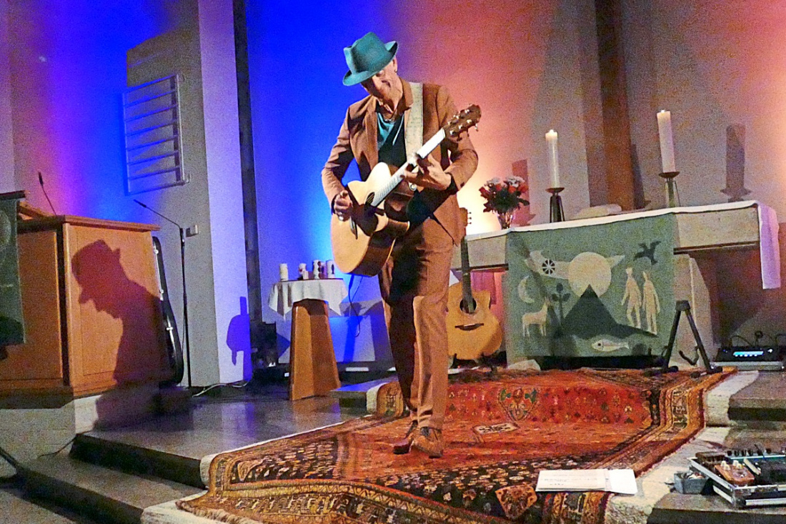 NT-ZIZISHAUSEN. Der Parochie-Ausschuss, verständlicher ausgedrückt: der kleine Kirchengemeinderat der Teilortkirchengemeinde Zizishausen, hatte kürzlich zu einem ganz außergewöhnlichen Gitarrenkonzert mit Matthias Waßer aus Schwäbisch Hall eingeladen. Matthias Waßer ist noch in guter Erinnerung geblieben. 2015 war er das erste Mal als Teil des Duos „Magic Acoustic Guitars“ in der Christuskirche. Nach rund achtzehn Jahren ist der Familienvater von zwei großen Töchtern seit Ende 2024 wieder solo unterwegs. Mitgebracht hatte er nur zwei alte Gitarren, einen Gitarrenbogen, ein Schnapsglas, ein bisschen Licht und etwas Elektronikkram. Waßer ist ein großer Freund von Medleys – einem Aneinanderreihen ineinandergreifender Melodien, in denen sich, etwas versteckt, die Musiktitel finden. Zuvor erklärte der Musiker noch, was das Publikum sodann zu hören bekommt. Er zupfte, trommelte und kratzte mit allen fünf Fingern der rechten Hand und griff, klopfte und schlug mit der linken Hand über die Stege seiner Gitarre – dabei gab er noch Vollgas, und das alles gefühlt gleichzeitig.