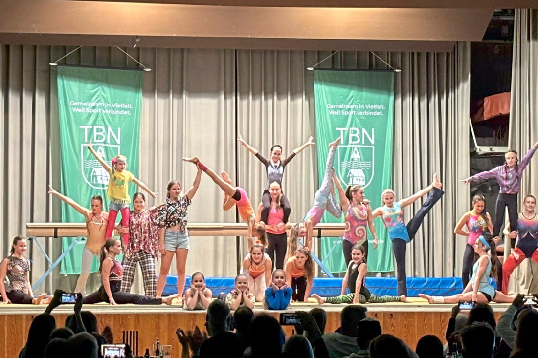Das Bühnenprogramm spannte einen breiten Bogen über alle Sparten des Vereins und zeigte eindrucksvoll, wie vielseitig der Turnerbund Neckarhausen ist. Mitreißender Showtanz mit akrobatischen Turnelementen, ein dynamischer Mountainbike-Auftritt, kraftvolle Einblicke in die Kampfkunst des Budo, schnelle Füße unserer Rope-Skipperinnen und humorvolle Einlagen vom WhatsApp-Gruppenchatsketch bis zum Stammtischgebabbel boten beste Unterhaltung für jedes Alter. Ergänzt wurde das abwechslungsreiche Programm durch beeindruckende Leistungen aus dem Bereich des Leistungssports im Super-Mario- sowie im 70er-Jahre-Stil.