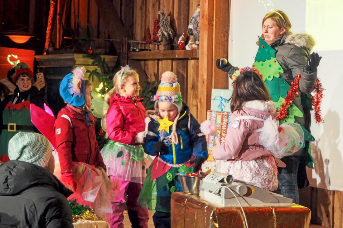 Besonders berührend wurde es beim gemeinsamen Singen. Als Publikum und Wichtel „Oh Tannenbaum“ anstimmten, verwandelte sich die Scheune in einen warmen, leuchtenden Klangraum voller strahlender Kinderaugen und mitwippender Eltern und Großeltern.