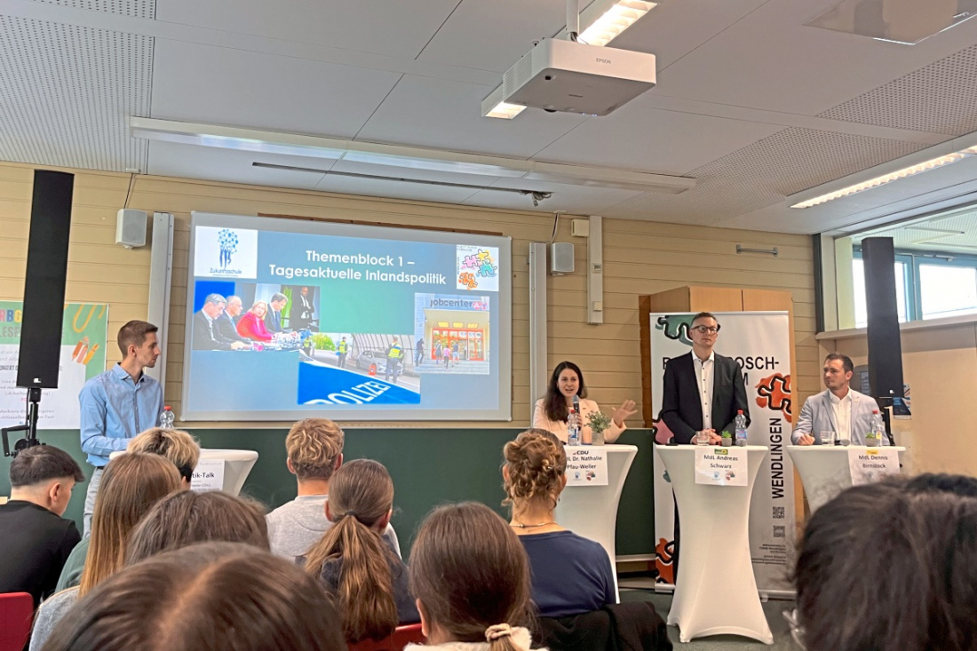 WENDLINGEN. Vor kurzem war es wieder so weit: Am Robert-Bosch-Gymnasium fand der jährliche Politik-Talk mit den Landtagspolitikern Dr. Nathalie Pfau-Weller (CDU), Andreas Schwarz (Bündnis 90/Die Grünen) und Dennis Birnstock (FDP) statt. Die Veranstaltung bot den etwa 150 Schülerinnen und Schülern die Gelegenheit, direkt mit den politischen Vertretern in den Dialog zu treten und aktuelle Themen aus der Landespolitik zu diskutieren. Nach einer Begrüßung durch Schulleiterin Karin Ecker präsentierten die drei Politiker zunächst ihre Perspektiven zu verschiedenen innenpolitischen Fragen. Die Jugendlichen aus der Jahrgangsstufe 1 und 2 nahmen diese Gelegenheit wahr, um gezielt nachzufragen – sei es zum Deutschlandticket, zu den Finanzierungsfragen der Gemeinden oder zur Zukunft der Asylpolitik. Besonders im Bereich Bildungspolitik war das Interesse groß, denn die jungen Zuhörer wollten wissen, wie das Bildungssystem in Baden-Württemberg in den kommenden Jahren gestaltet werden könnte. Während sich in einigen Punkten Übereinstimmung zeigte, traten bei der Einschätzung der aktuellen Bundesregierung auch deutliche Differenzen zu Tage.