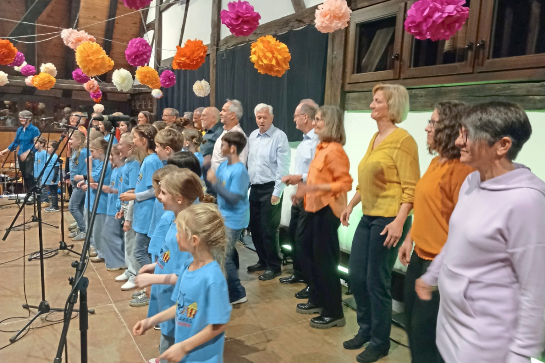 Die teils in englischer, teils in deutscher Sprache vorgetragenen Lieder wurden abschnittsweise von Personen aus den Chören anmoderiert. Dabei bekam das Publikum Hintergrundinformationen zu den Stücken und die englischen Texte wurden sinngemäß ins Deutsche übersetzt. Gerade bei den englischen Liedern kam so der oft sozialkritische Inhalt deutlich zum Vorschein. Selbstverständlich durften die Kinder und Jugendlichen ihre Titel selbst ansagen. Im wahrsten Sinne des Wortes haben unsere Nachwuchschöre mit einem eigenen Text von Jana Kampmann zu einer bekannten Melodie „Beuren gerockt“! Es war ein Genuss, die Kinder und Jugendlichen auf der Bühne agieren zu sehen. Auswendig, selbstsicher und mit vollem Körpereinsatz präsentierten sie ihre Stücke. – Großartig!