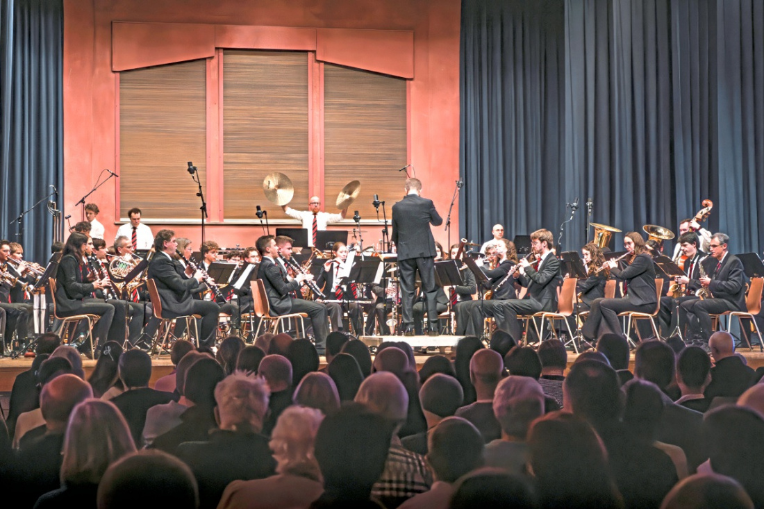 Im Anschluss zeigte das vielfach ausgezeichnete Jugendblasorchester seine Qualitäten. Besonders „Variazioni in Blue“ überzeugte durch stilistische Vielfalt zwischen klassischen Themen, Jazz und folkloristischen Elementen. Ein besonderes Zeichen der lebendigen Vereinsarbeit setzte der gemeinsame Auftritt von Vororchester und Jugendblasorchester. Rund 60 junge Musikerinnen und Musiker standen gemeinsam auf der Bühne und verdeutlichten eindrucksvoll die enge Verzahnung von Stadtkapelle und Musikschule.