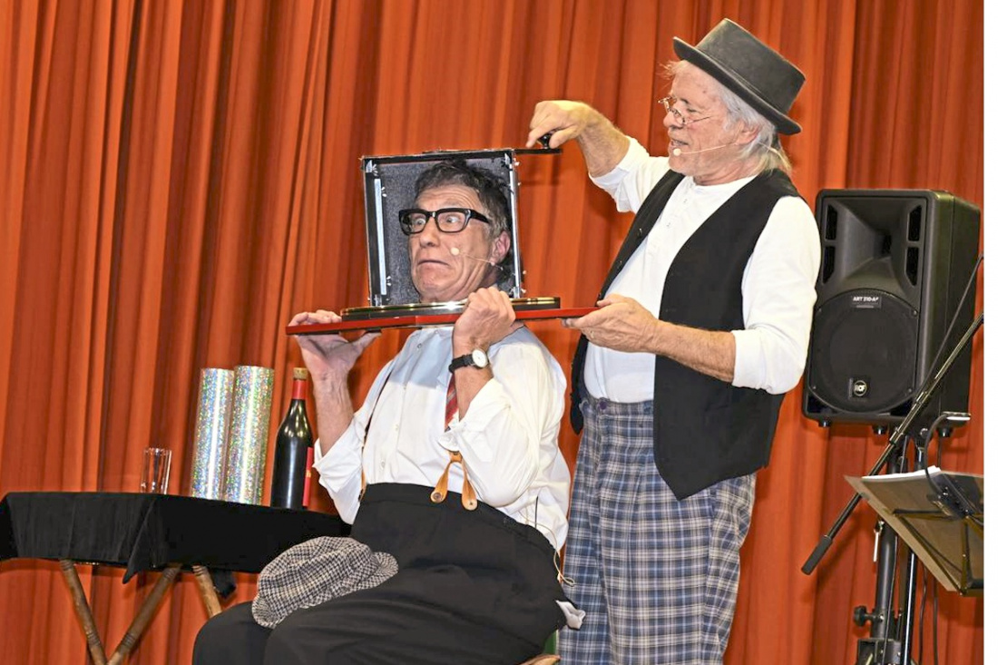 Nachdem das letzte Musikstück des Posaunenchores verklungen war, wurde beim Ansehen vieler schöner Fotos in der Vergangenheit geschwelgt. Nach der Pause unterhielten die „Spätzünder“ aus dem Raum Reutlingen die Gäste aufs Beste. Lustige Wortspiele, kleine Zaubertricks und unterhaltsame Liedtexte, musikalisch perfekt umgesetzt von Mampfred und Wunderle, brachten alle zum Staunen, Schmunzeln und Lachen. Kurz nach 21 Uhr war dann das offizielle Programm beendet und das letzte „Come-together“ des Abends wurde noch längere Zeit genossen.