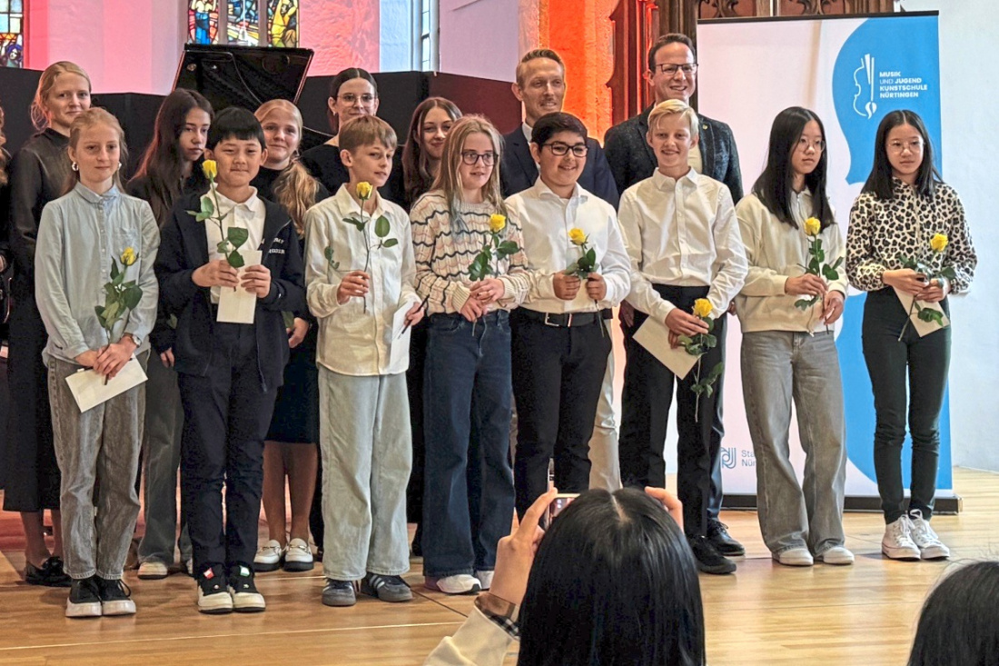 Den Höhepunkt des Vormittags bildete die Ehrung der Preisträgerinnen und Preisträger durch Oberbürgermeister Johannes Fridrich. Mit persönlichen, herzlichen Worten würdigte er die jungen Talente und betonte den hohen Stellenwert musikalischer Bildung in Nürtingen.
