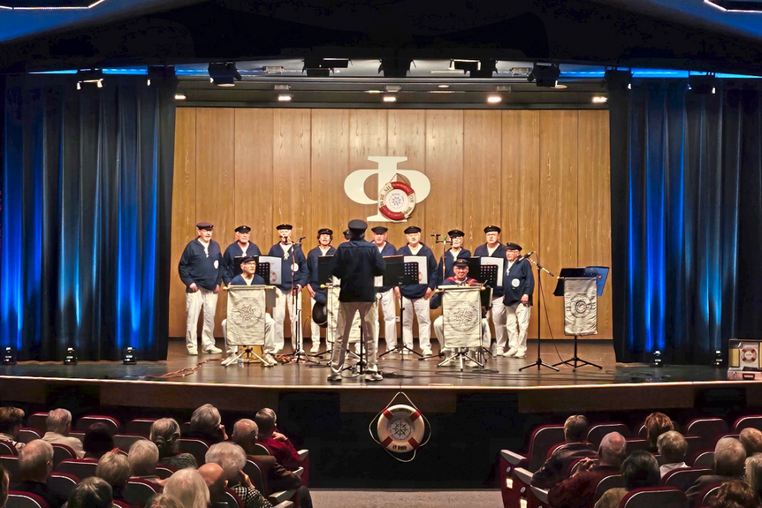 Schon bei der Eröffnungsmelodie wurde kräftig mitgeschunkelt und beim „Hamburger Veermaster“, auf Plattdeutsch von Adi Oldendorf gesungen, wurde der Refrain mitgesungen. In der Folge brannten die „Neckar-Knurrhähne“ ein Feuerwerk seemännischer Lieder und Schlager ab. Besungen wurde die Nordsee von Hamburg Richtung Helgoland und weiter zur Insel Sylt, bevor es zurück in die „Hafenbar“ ging. Jeder Vortrag wurde mit herzlichem Beifall bedacht. Auch der Abschied konnte erst nach mehrfacher Zugabe erfolgen. Die Männer um Chorleiter Hermann Kovacic bedankten sich bei den verantwortlichen Damen des Augustinums für die Organisation des schönen Abends.