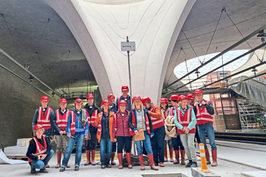 Nach diesem ersten Teil ging es zur Schutzkleider-Anprobe. Alle bekamen rote Sicherheits-Gummistiefel sowie gleichfarbige Warnwesten und -helme. So ausgestattet betraten die Besucher das Baugelände und tauchten in die Welt des Architekten Ingenhofen ein. Eine Welt aus weißem Sichtbeton, runden Lichtaugen aus einer einzigartigen Stahl- und Glaskonstruktion und Granitplatten als Bahnsteigbelag, die in den ursprünglichen Architektenplänen aus Marmor hätten sein sollen.