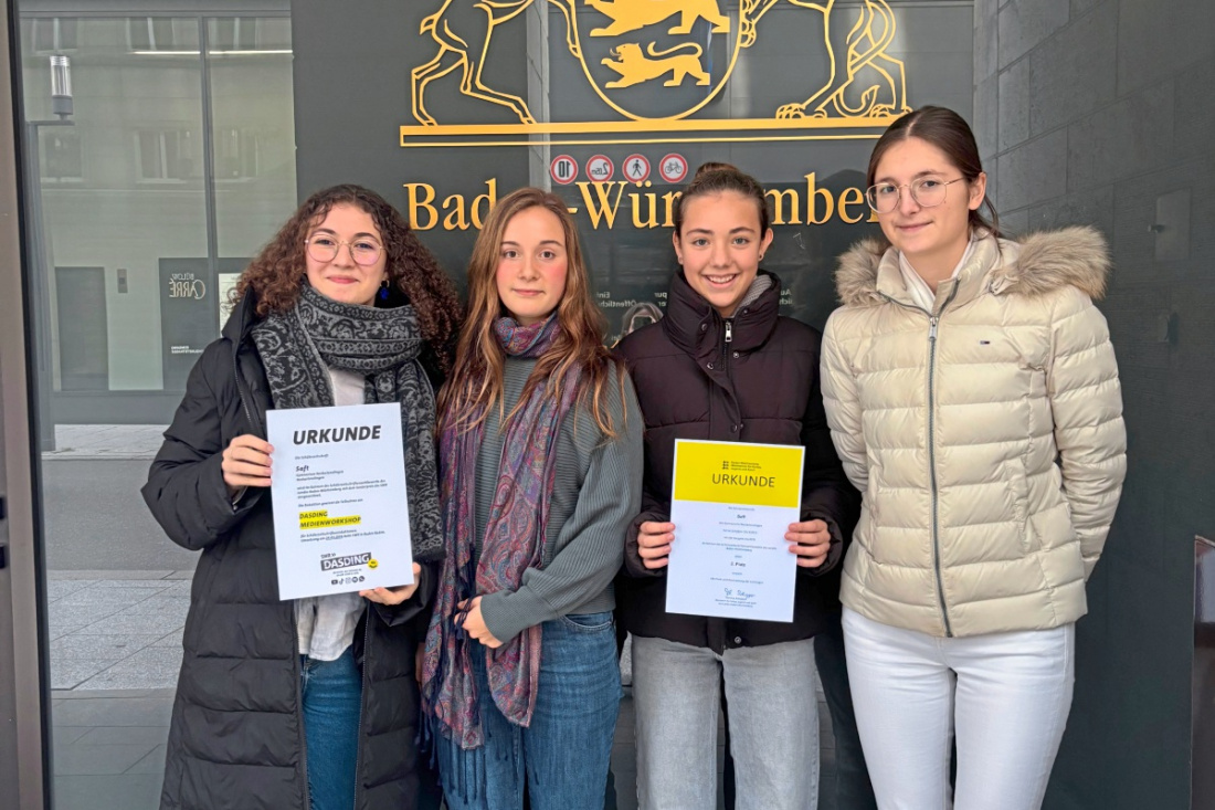 Die Redakteurinnen Mara Bollinger, Finja Schilling, Lana Schmidt sowie Lara Rabausch nahmen im Anschluss die Urkunde zum Dritten Preis sowie einen Zusatzpreis des Jugendradios des SWR „DASDING“ stellvertretend für die gesamte Saft-Redaktion entgegen und das nun bereits zum dritten Mal.