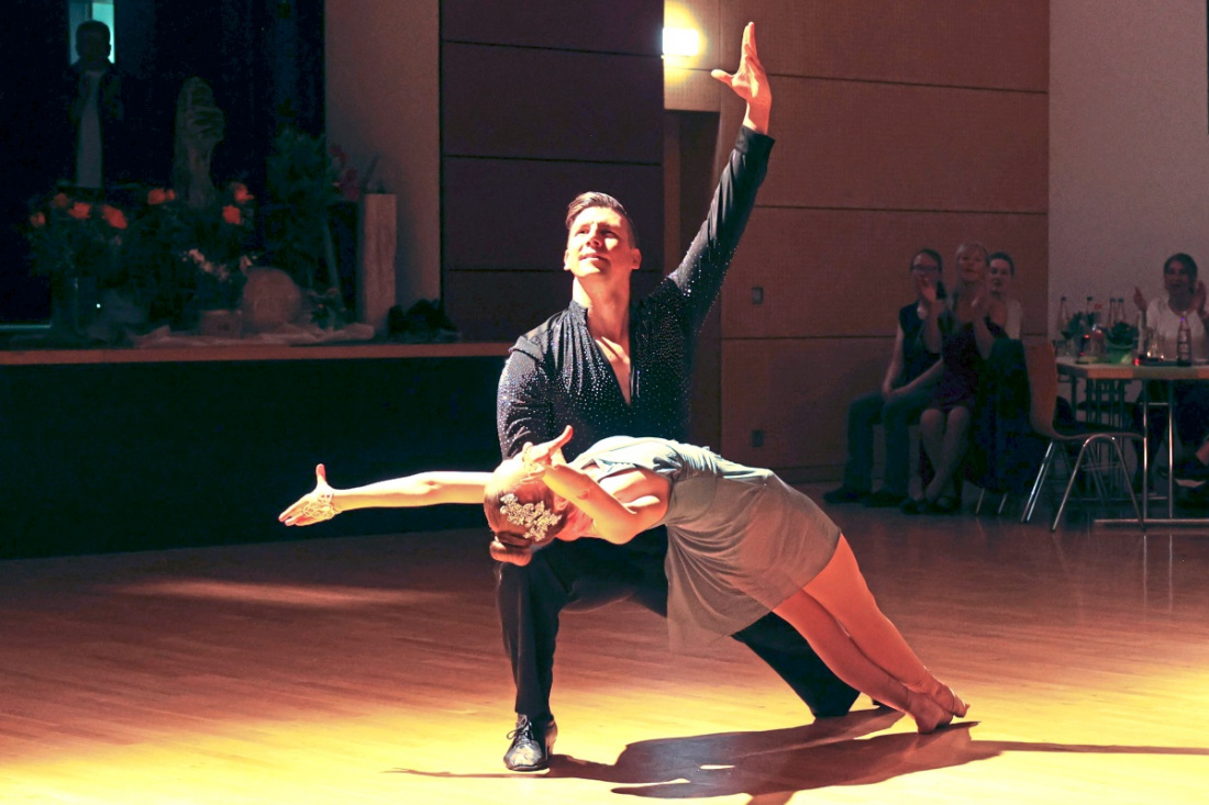 Im zweiten Teil des Showprogramms konnten die Ballgäste eine außergewöhnliche Art des Tanzsports bewundern. Das SKV-Trainerpaar Thilo und Anna Nast verzauberte die Besucherinnen und Besucher mit einer atemberaubenden Tanzshow. Mit äußerster Präzision und Sicherheit ausgeführte, spektakuläre Dreh- und Hebefiguren reihten sich aneinander. Scheinbar mühelos gelangen den beiden akrobatische Figurenteile, welche den Gesamteindruck von vollendeter Harmonie des Paartanzes vermittelten. Ein grandioser Auftritt, der mit tosendem Beifall bedacht wurde. Für diesen bedankte sich das Tanzpaar gerne mit einer kurzen Wiederholungszugabe.