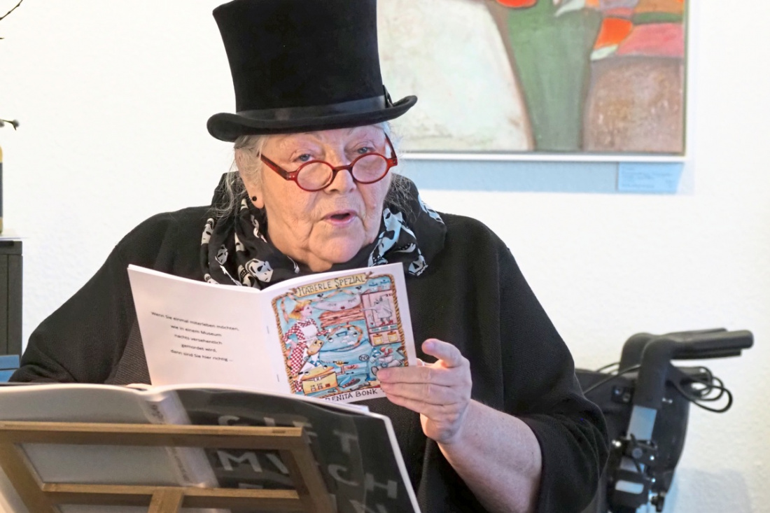 Die Wahl-Nürtingerin, gelernte Goldschmiedin und Damenschneiderin mit Meistertitel und Diplom, schreibt gerne Kurzgeschichten. Am liebsten mit kriminellem Hintergrund. Sie ist aber auch eine ganz hervorragende Zeichnerin. Die Cover für ihre Büchlein mit Kurzgeschichten entwirft sie selbst. Ihr künstlerisches Talent stellte Benita Bonk bereits bei einer Ausstellung im Sprechzimmer vor zwei Jahren unter Beweis.