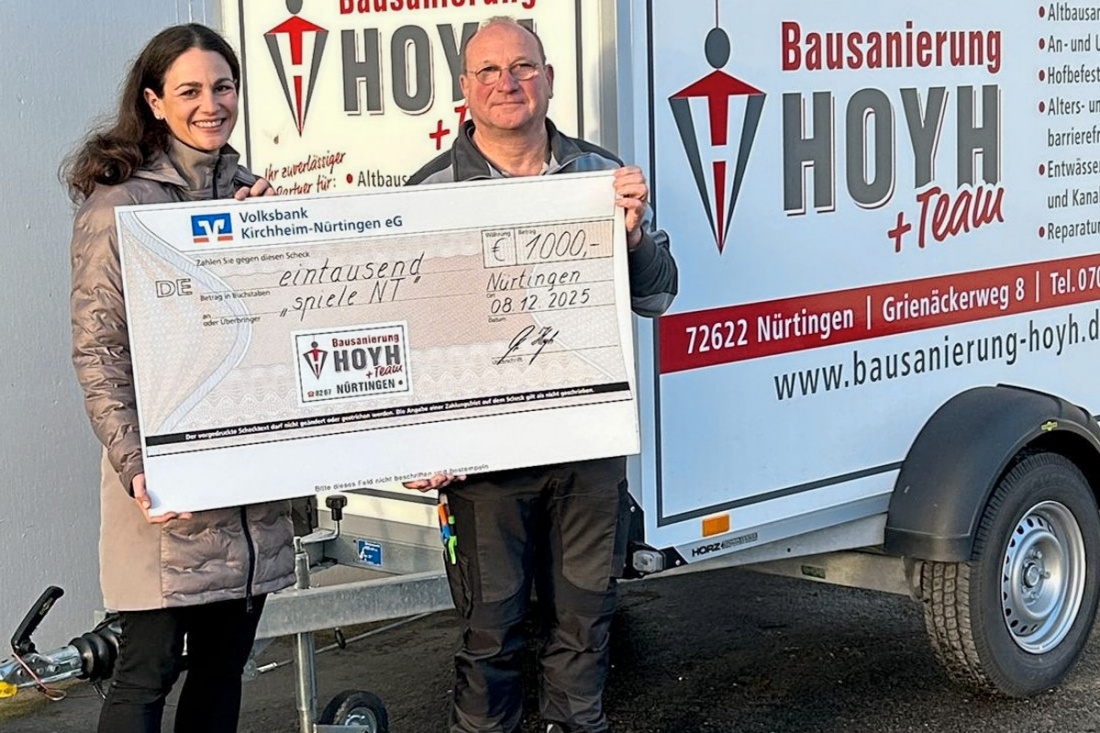 NÜRTINGEN. Getreu dem Motto „Spenden statt Schenken“ verzichtet das Nürtinger Traditionsunternehmen Bausanierung Hoyh Team GmbH auf Kundenpräsente zu Weihnachten und unterstützt stattdessen Vereine und soziale Einrichtungen aus der Region. Dieses Jahr geht die Spende des Spezialisten für Umbau, Sanierung und Renovierung in Höhe von 1000 Euro an den Nürtinger Verein SpieleNT. „Kinder liegen uns ganz besonders am Herzen. Dass sie die Möglichkeit haben, sich frei zu entfalten und motorisch gut zu entwickeln, ist uns ein großes Anliegen“, sagt Betriebsleiter Thomas Hoyh. Der Förderverein für ein kinder- und jugendfreundliches Nürtingen wurde 2023 gegründet und hat das Ziel, die Spielplatzsituation in Nürtingen zu verbessern. 2026 plant der Verein die Realisierung eines inklusiven Spielplatzes am Nürtinger Galgenbergpark, der gemeinsames Spielen von Kindern mit und ohne Handicap ermöglichen soll.