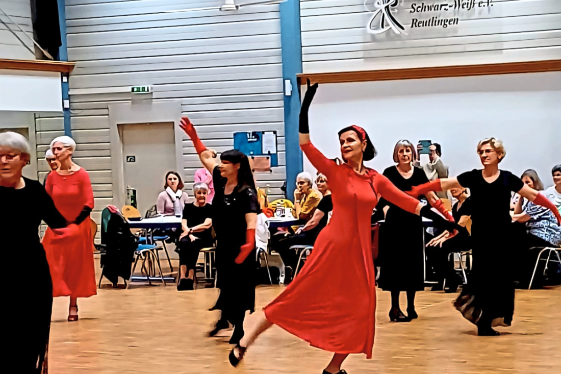 FRICKENHAUSEN. Auch in diesem Jahr waren die Modern Line Dancerinnen des TSV Frickenhausen wieder gerne gesehene Gäste bei der Modern Line Dance Party, die kürzlich im Tanzsportcentrum Schwarz-Weiß Reutlingen stattfand. Bei Kaffee und selbstgebackenen Kuchenspezialitäten erfreuten sich die Line Dancerinnen an Tanzvorführungen und wurden selbst aktiv beim vielfältigen Tanzangebot! Um 16 Uhr eröffnete Barbara Bader die Party und kündigte das Opening der Showtanzgruppe des TC SW RT an, die ein Latein-Medley aufs Parkett legte. Tanzsporttrainerin Karin Deisinger zeigte eine Rumba-Samba-Choreo und lud gleich anschließend zur Lateinrunde sowie einer Salsa auf die Tanzfläche. Sylvia Kimmerle leitete die folgenden Publikumstanzrunden mit Einsteigertänzen an und sorgte für eine volle Tanzfläche. Danach lebten die 50er/60er Jahre wieder auf mit Swing, Boogie, Twist und BossaNova. Während die Gäste sich ausruhten, präsentierte die Showtanzgruppe einen Stocktanz mit leuchtenden Tanzstöcken sowie einen Tango Argentino. Anschließend lud Barbara Bader das Publikum dazu ein, einen Langsamen Walzer mitzutanzen. Das Highlight des Nachmittags zeigte die Teilnehmerinnen des kürzlich stattfindenden Schwungtanz-Workshops, darunter auch einige Frickenhäuser Tänzerinnen: In schwarz/roten Tanzkleidern präsentierten sie ihren erarbeiteten Wiener Walzer. Der Tanznachmittag endete gegen 19 Uhr mit zwei Partytänzen. Besonderer Dank geht an Sylvia Kimmerle und Barbara Bader sowie an Fritz Maiero, der für den Musikeinsatz sorgte und kurzweilig durch den Nachmittag moderierte.