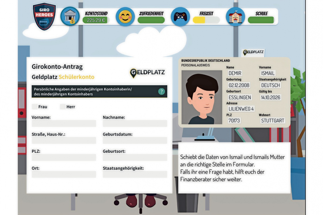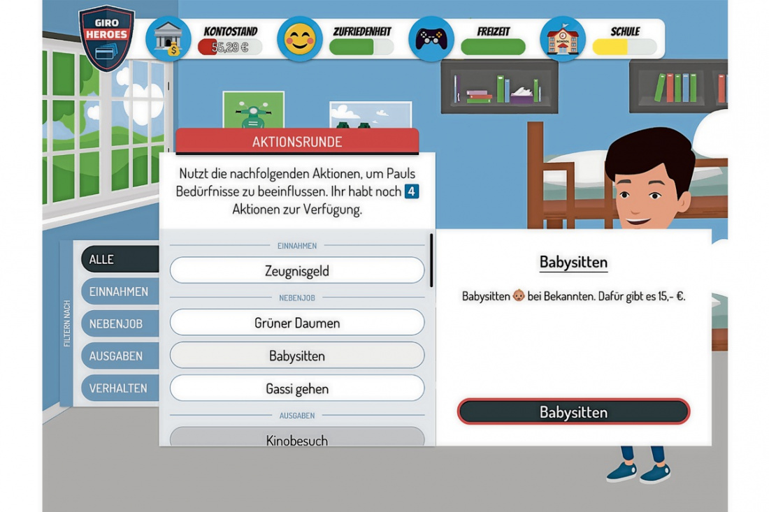 Mit den drei digitalen Lernmodulen der Bildungsstiftung erobern sich die Schülerinnen und Schüler die Finanzwelt spielerisch. „GiroHeroes“ bietet zum Einstieg bis Klasse 8 alles Wichtige rund ums Girokonto, GiroCard, Überweisung, Lastschrift, Onlinebanking, Kredit, PIN und TAN. Das darauf aufbauende Lernspiel „FinanceHeroes“ umfasst die Themen Sparen, Budgetierung, Kredite, Finanzierung und Versicherungen und eignet sich für die Klassen 9 und 10. Mit Informationen rund um Börse, Wertpapiere, Handel, Diversifikation und Altersvorsorge rundet das ab Klasse 10 und für Auszubildende konzipierte Planspiel „BörsenHeroes“ die Lernreihe ab.