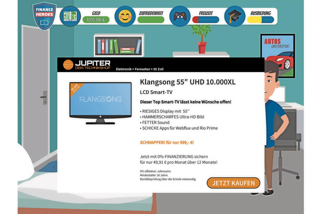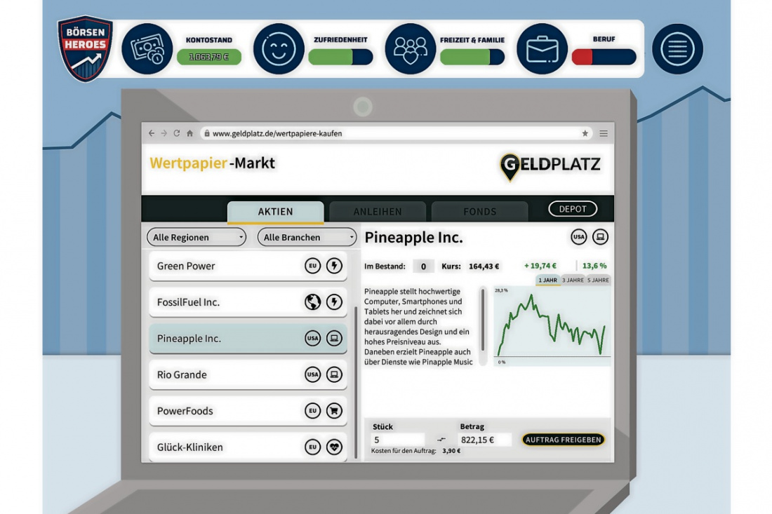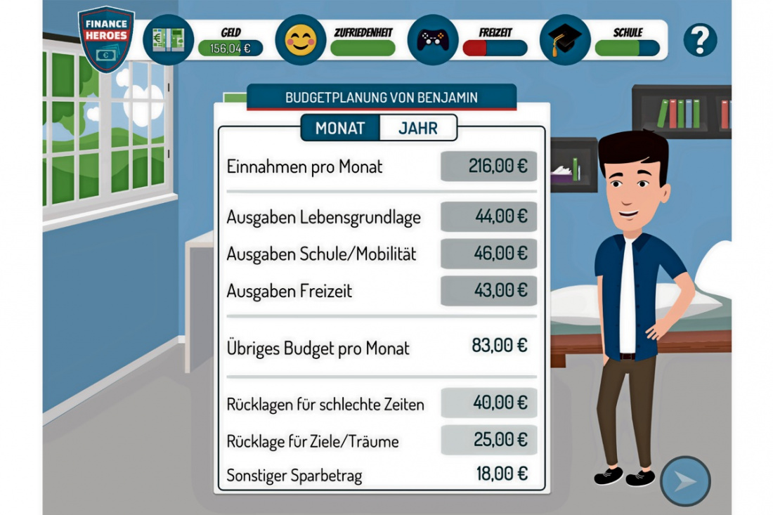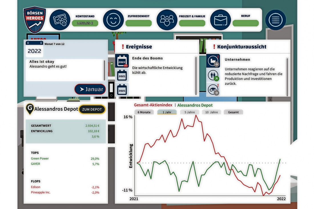 Die digitalen Planspiele „GiroHeroes“, „FinanceHeroes“ und „BörsenHeroes“ machen Schülerinnen und Schüler zu Finanzexperten in eigener Sache. Die didaktisch sinnvollen und aufeinander aufbauenden Lerneinheiten von der einfachen Überweisung über die Altersvorsorge bis hin zu komplexen Börsenfragen treten den Beweis an, dass Finanzbildung nicht dröge sein muss.
