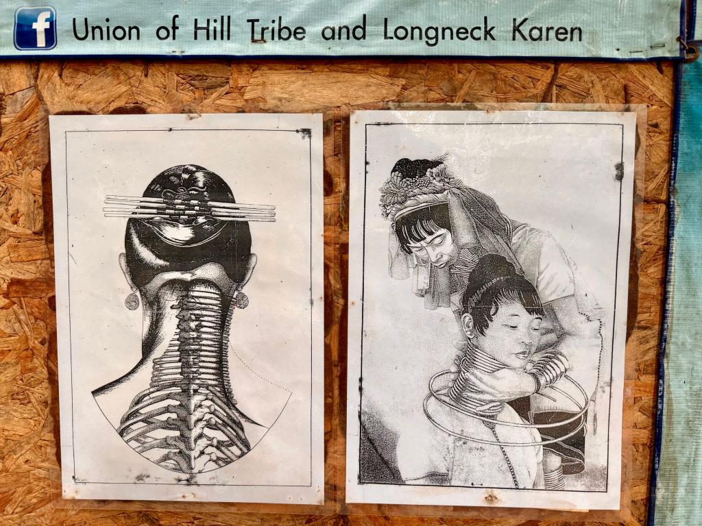Am Rand der Berge nördlich von Chiang Rai sitzen Frauen vor ihren Hütten und weben flink bunte Schals. An einer Bambusstange wehen die fertigen Handarbeiten im Wind. Sie dienen als eine Art «Tauschgeschäft»: Touristen kaufen die Souvenirs und dürfen im Gegenzug Fotos von den «Long Neck Karen» machen, deren Hälse durch Dutzende spiralförmige Messingringe in die Länge gestreckt zu sein scheinen. «Giraffenfrauen» werden sie im allgemeinen Sprachgebrauch oft genannt, auch wenn der Begriff als Beleidigung gilt.