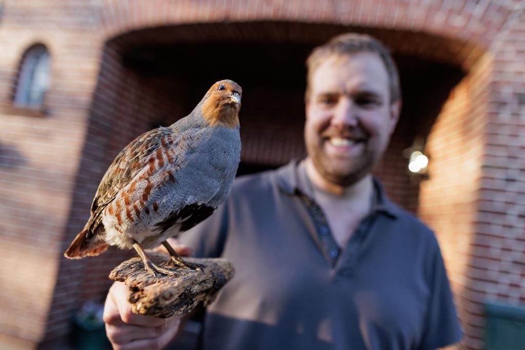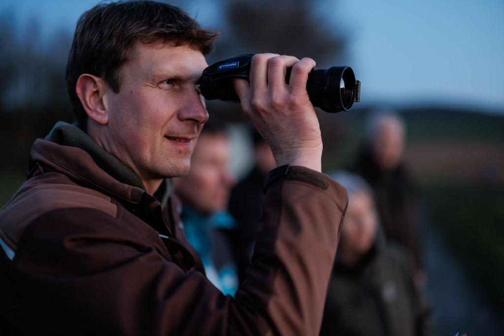 Hier ist besetzt! Das macht der Hahn mit seinem Krächzen Konkurrenten deutlich. Der Ton kommt allerdings aus einem Lautsprecher, den Marcel Holy in den Abendhimmel hält. Es handelt sich um eine akustische Provokation. Der Leiter der Natur- und Umweltschutzvereinigung Dümmer gaukelt Rebhühnern vor, dass da ein anderer Hahn in der Dunkelheit steht.