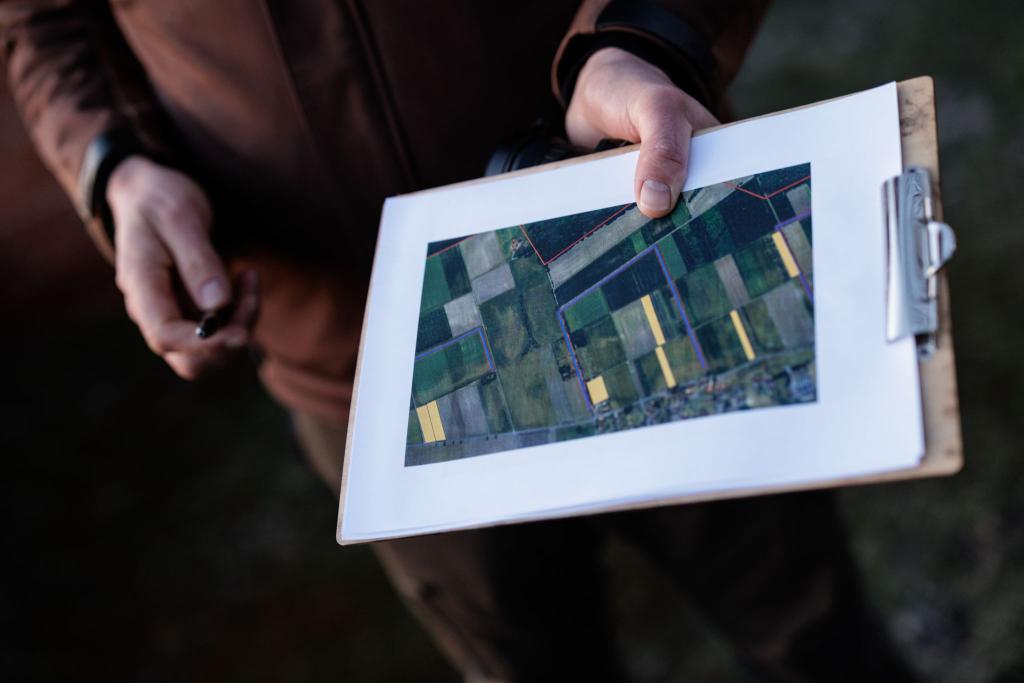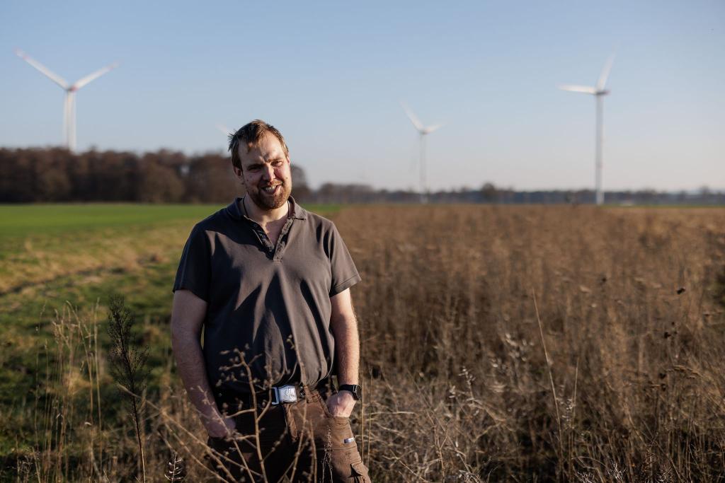 Landwirt Christian Wiese lebt und arbeitet unweit von Brockum in Stemwede in Nordrhein-Westfalen. Die Landesgrenze zu Niedersachsen verläuft unsichtbar irgendwo zwischen den Windrädern hinter ihm. Bereits seit fünf Jahren ist er für das Rebhuhn dabei, schafft «Unterschlupf, Nahrung, Sicherheit». Direkt neben Blühpflanzen stehen weitere Pflanzen und Getreide, die nicht geerntet wurden.