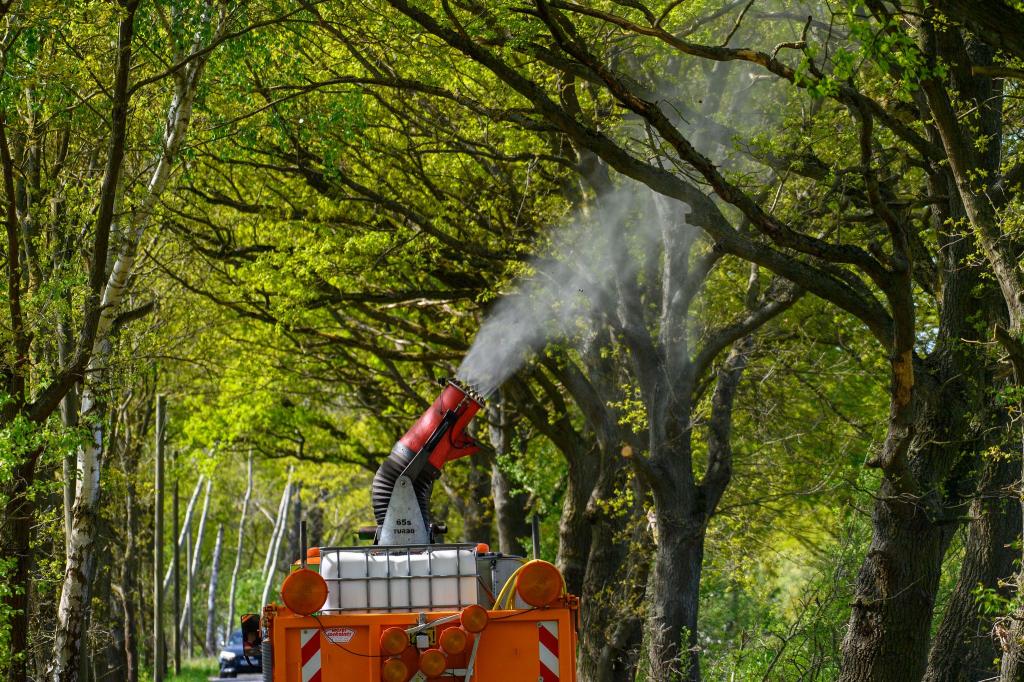 - Biologische Spritzmittel: In vielen Städten wie Frankfurt, Kaiserslautern, Mainz und Wiesbaden werden Eichen präventiv mit dem Bakterium Bacillus thuringiensis behandelt, dessen Giftstoffe - sogenannte Bt-Toxine - die Larvenentwicklung stoppen. In Brandenburg kommt ein darauf basierendes Präparat zum Einsatz. Etwa in Darmstadt werden für die großflächige Ausbringung in unzugänglichen Gebieten Hubschrauber eingesetzt.