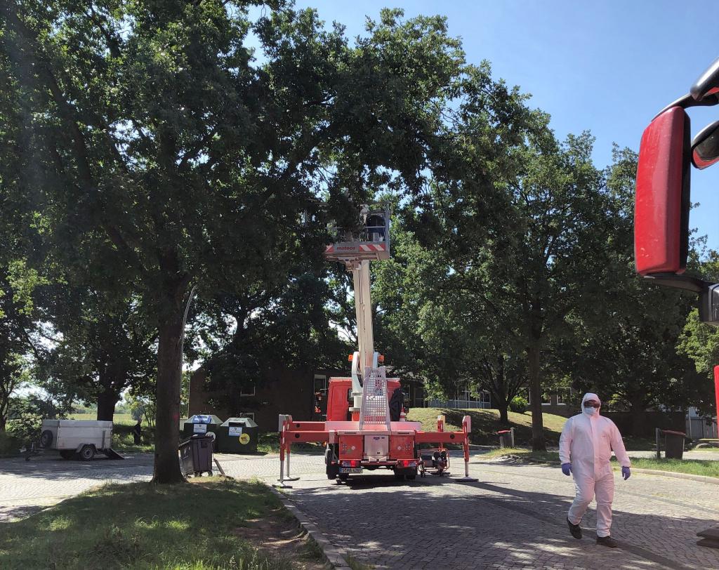 - Mechanische Verfahren: Bewährt hat sich das Absaugen der Nester mit Spezialsaugern durch Fachfirmen. Dies wird bundesweit in fast allen betroffenen Kommunen praktiziert. In Worms werden zudem spezielle Kunststoff-Manschetten als Fallen um die Stämme von Bäumen gewickelt.