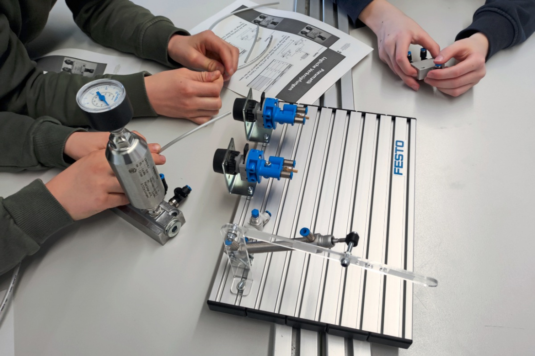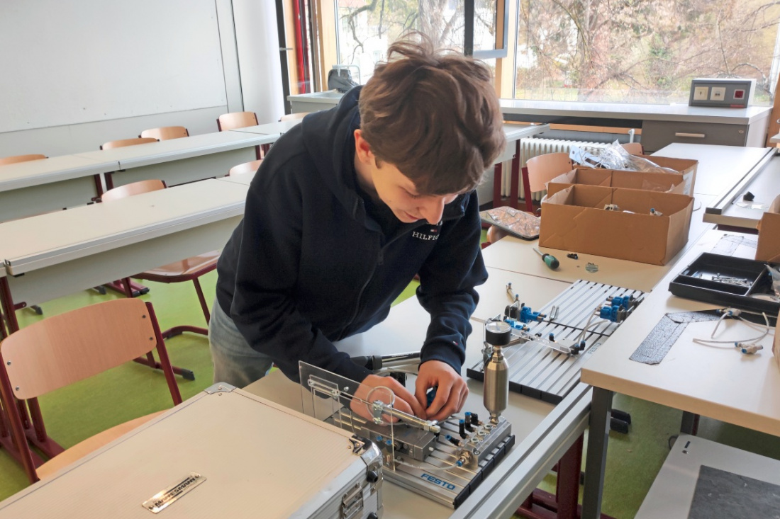 Mit dem Pneumatik-Modell, das Mika Auer für den Pneumatik-Kurs vorbereitet, wird das Öffnen einer Bustür simuliert. Foto: Kseniia Ilina