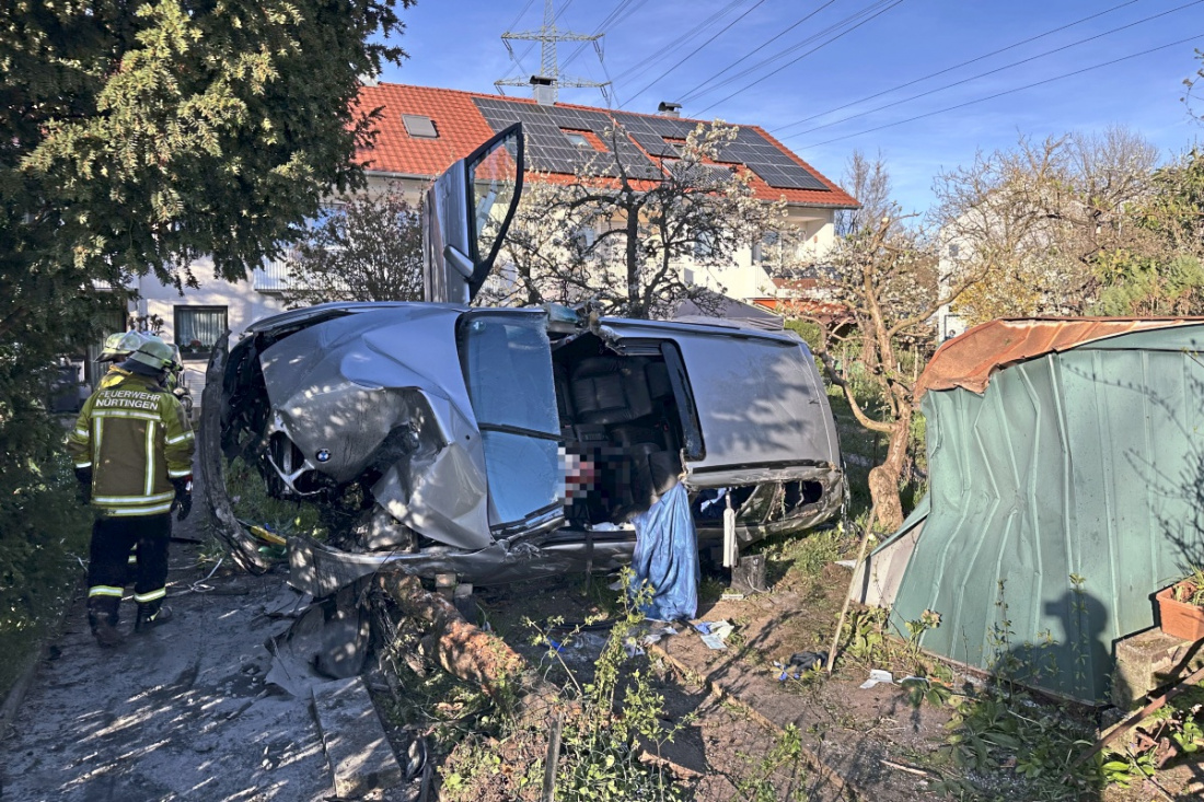 Unfall in Nürtingen: Grauer BMW landet im Vorgarten
